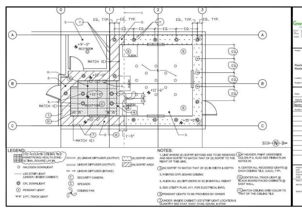 pdf of scaled CAD drawings with measurements: floor plan, furniture plan, reflected ceiling/lighting plan, electrical outlet & switch plan, finish plan)